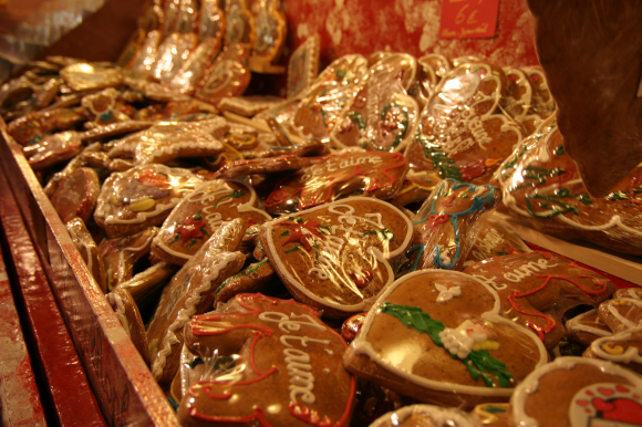 Le marché de Noël est plein de produits et d’articles traditionnels : des bonbons, du vin chaud, des crêpes etc…