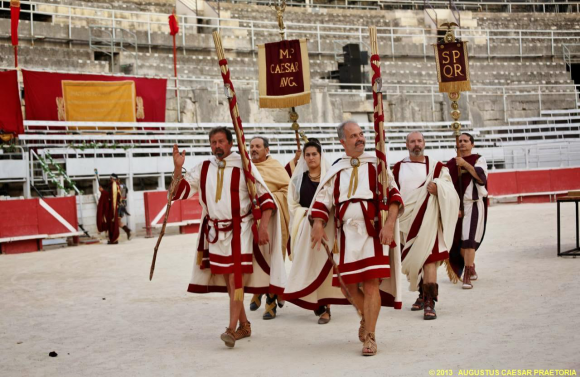 下の写真の男性は赤くて幅が広いストリップの白いチュニックを着ていることで政府のトップにある「Senatus」だとわかります。