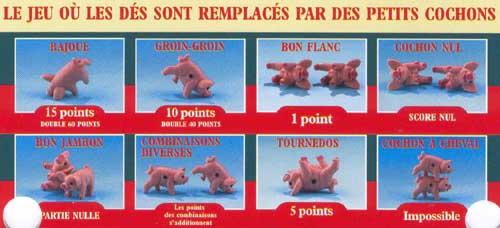 Il s’agit de lancer deux petits cochons, d’observer leurs positions et de compter les points, les deux positions les plus recherchées étant le Groin-Groin et la Bajoue.
