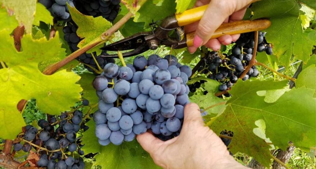 Pendant les vendanges, les viticulteurs et des saisonniers travaillent dans les vignes. Ils vont utiliser un sécateur, un outil qui ressemble à des ciseaux, pour couper les grappes de raisin et les mettre dans des paniers. Ensuite, ils vont transporter les raisins dans des caves, où ils vont presser le raisin pour en faire du jus, puis du vin.