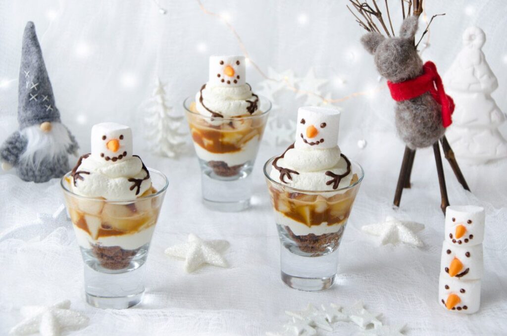 La bûche de Noël reste un classique. On peut l’acheter ou la faire. Elle peut aussi être glacée pour finir le repas sur une note de fraîcheur. On peut aussi faire des verrines sucrés avec des designs mignons !